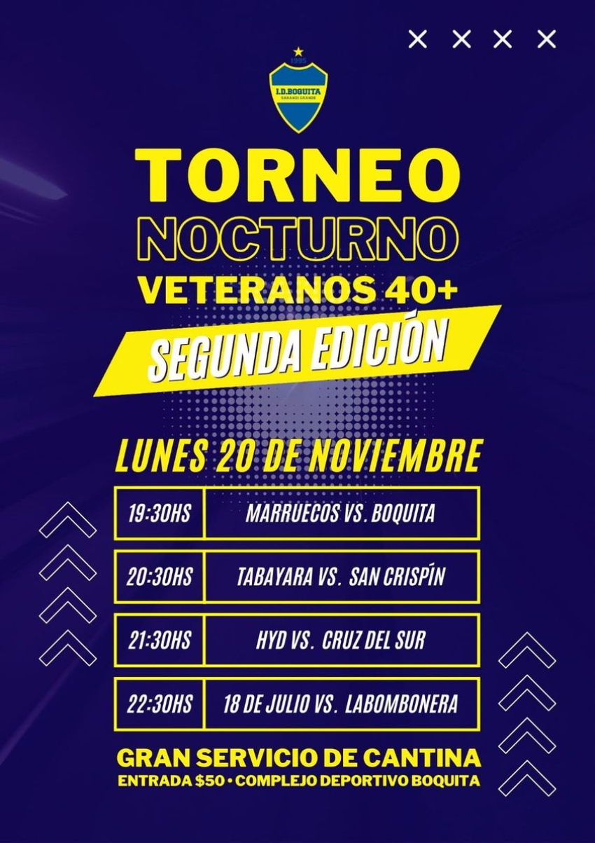 Continúa hoy el Torneo Nocturno Veteranos +40 que organiza la Institución Deportiva Boquita de Sarandí Grande. Desde las 19.30 hs se enfrentarán Marruecos vs Boquita, Tabayara vs San Crispín, HYD vs Cruz del Sur y 18 de Julio vs La Bombonera.