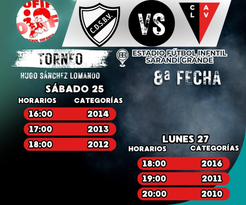 El Club Deportivo y Social Barrio Viña de Sarandí Grande disputará varios partidos ante La Vascongada por la 8ª fecha del Torneo de Fútbol Infantil de la Organización del Fútbol del Interior (OFI) "Hugo Sánchez Lomando" en el Estadio de Fútbol Infantil de Sarandí Grande: