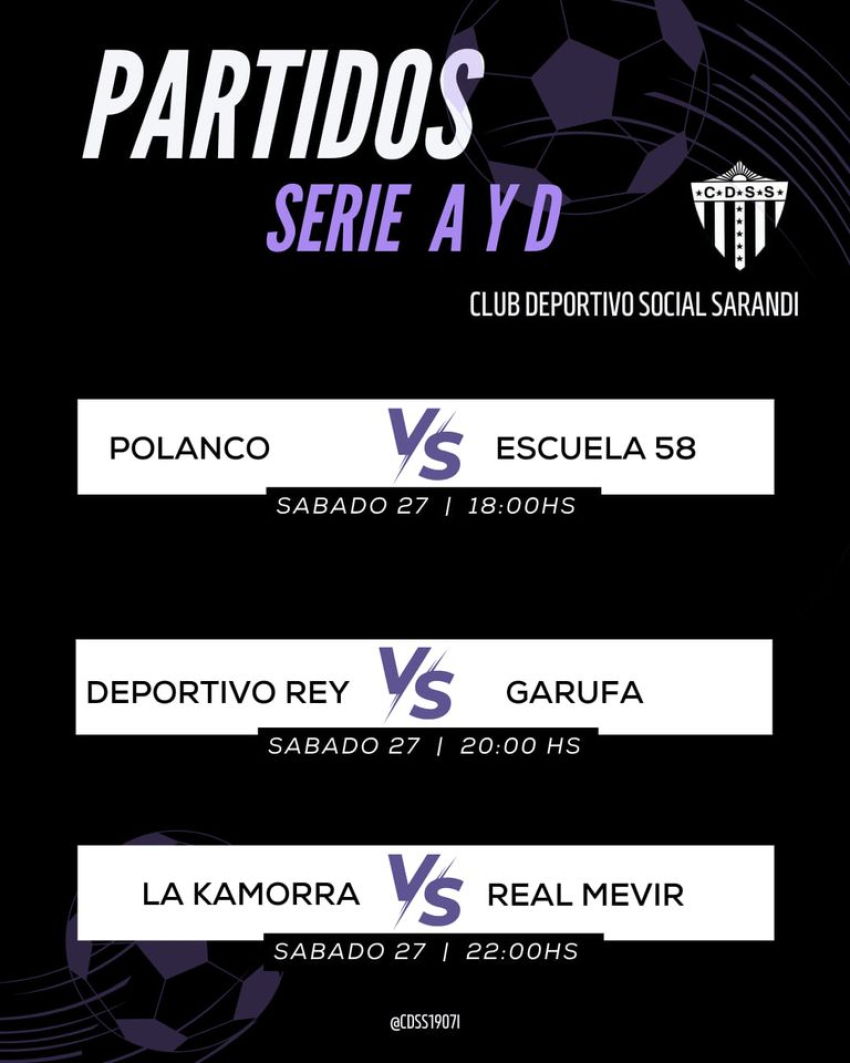 Polanco vs Escuela 58 a las 18 hs, Deportivo Rey vs Garufa a las 20 hs, y La Kamorra vs Real Mevir a las 22 hs serán los partidos que se disputarán hoy por el 9° Campeonato Barrial 2024 organizado por Club Deportivo y Social Sarandí en Sarandí Grande.