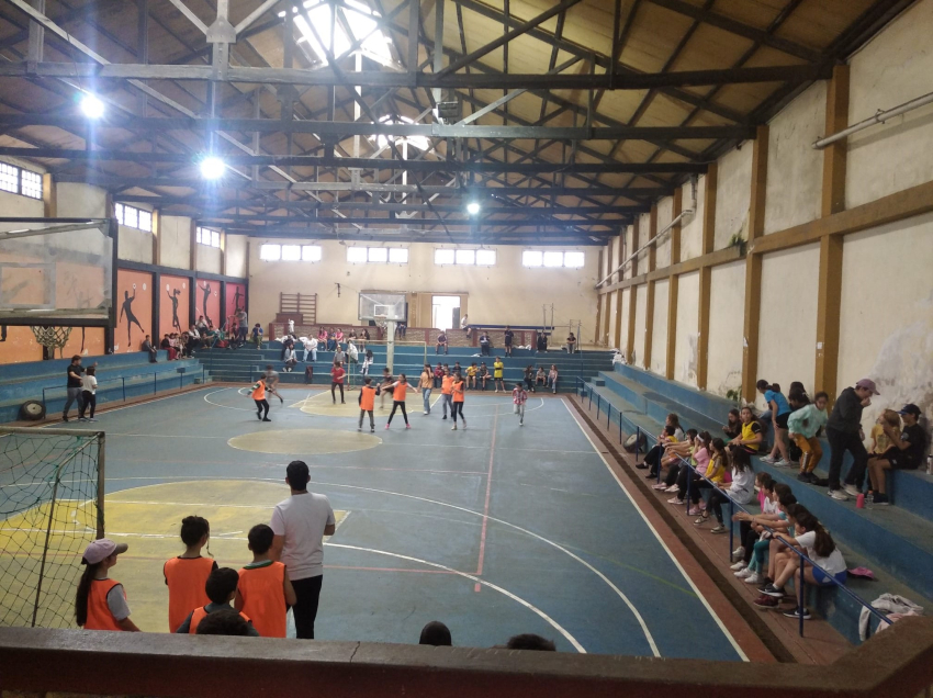 Niños de las escuelas 38, 7 y 113 de Sarandí Grande están compartiendo un encuentro de básquetbol en el Gimnasio 12 de Octubre de ésta ciudad. En la mañana participaron los grupos del turno matutino y en la tarde lo harán los del turno vespertino. El objetivo principal de la actividad es integrar a los escolares de los distintos centros educativos.