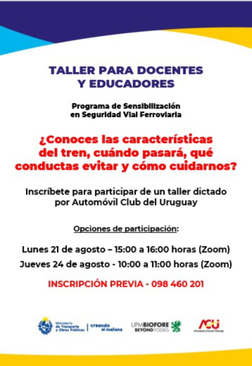 El Automóvil Club del Uruguay está ofreciendo un taller para docentes y educadores sobre el Programa de Sensibilización en Seguridad Vial Ferroviaria. El objetivo del taller es "brindar información sobre las características del tren, cuándo pasará, qué conductas evitar y cómo cuidarnos".