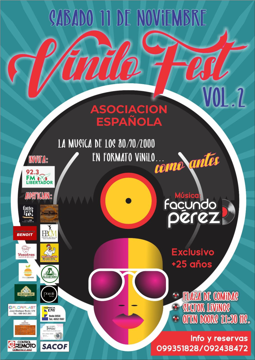 "Vinilo Fest", una fiesta con con música de los años 80, 90 y 2000 en formato vinilo a cargo de Facundo Pérez, se celebrará el sábado 11 de noviembre en la Asociación Española de Florida, y Sarandí 365 sorteará dos entradas entre aquellos que le den "Me Gusta" a ésta publicación en Facebook e Instagram. El evento es exclusivo para mayores de 25 años y las puertas se abrirán a las 21:30 hs. Para más información o reservas, se puede comunicar al 099351828 o 092438472.