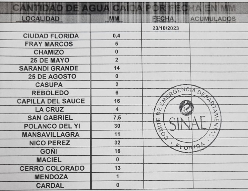 Nico Pérez con 32 mm y Polanco del Yí con 30 mm fueron los sitios del departamento de Florida con más lluvia. En Sarandí Grande llovieron 14 mm.