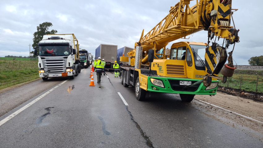 El vehículo circulaba de Norte a Sur, procedente de la planta de UPM y con destino a Montevideo, cuando su conductor, con visibilidad limitada también por la lluvia, no llegó a percatarse de que el sector se encuentra en obra, en el marco de la construcción de la doble vía, y al pasar sobre el desnivel, quedó inclinado. Inmediatamente, personal de Policía Caminera de Durazno aseguró la zona, mientras personal de la citada empresa procedía, por intermedio de una grúa, a transbordar la celulosa hacia otro camión, habilitándose el tráfico por una sola vía hasta última hora de la tarde.