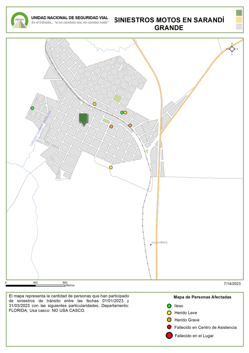 Ninguno de los motociclistas víctimas de accidentes de tránsito en los tres primeros meses de 2023 en Sarandí Grande llevaba casco protector en el momento en que ocurrió el siniestro, según datos oficiales de la Unidad Nacional de Seguridad Vial (UNASEV); en base a Sistema de Gestión de Seguridad Pública (SGSP) del Ministerio del Interior.