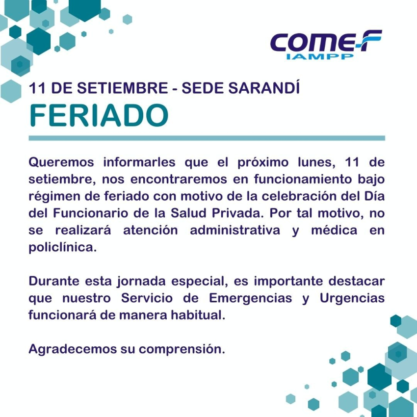 COMEF-IAMPP informa que el próximo lunes 11 de septiembre, la sede de Sarandí Grande operará bajo régimen de feriado debido a la celebración del Día del Funcionario de la Salud Privada. Como resultado, no habrá atención administrativa ni médica en la policlínica. Sin embargo, el Servicio de Emergencias y Urgencias funcionará normalmente durante este día festivo. COMEF agradece su comprensión.