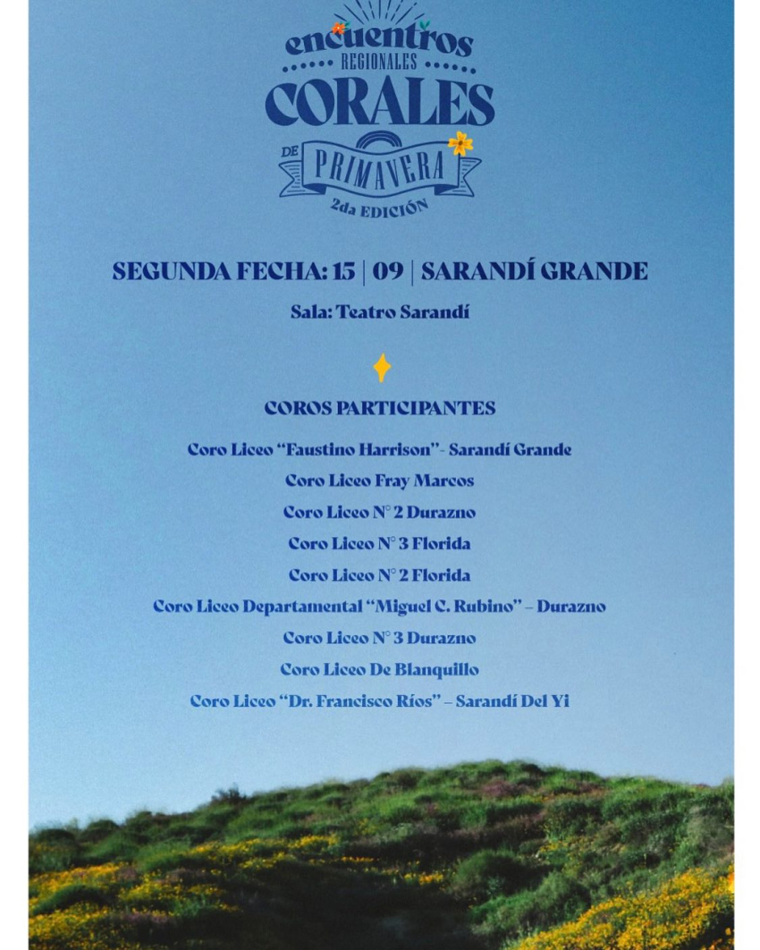 La segunda edición de los Encuentros Regionales Corales de Primavera tendrá lugar el 15 de septiembre en el Teatro de Sarandí Grande. La cita será en el Teatro Sarandí, donde nueve s de diferentes liceos de la región se darán cita para deleitar al público con sus voces.