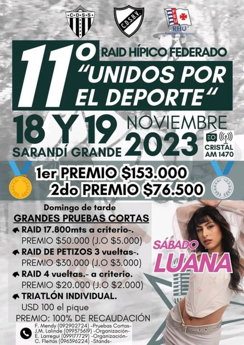 El Club Deportivo y Social Sarandí (C.D.S.S) y el Club Deportivo Social Barrio Viña (C.D.S.B.V) están organizando el Raid Hípico Federado "Unidos por el Deporte". El evento tendrá lugar los días 18 y 19 de noviembre de 2023 en Sarandí Grande.