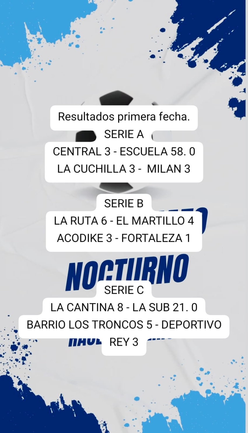 La Cantina se impuso 8 a 0 a La Sub 21 y Barrio Los Troncos 5 a 2 a Deportivo Rey, por la serie B de la primera fecha del Campeonato Nocturno "Raúl Barreiro" que se desarrolla en la localidad de Pueblo Barceló (Pintado). En los demás partidos de la fecha, por la serie A Central le ganó 3 a 0 a Escuela 58, La Cuchilla empató 3 a 3 con Milán, mientras que por la serie B La Ruta se impuso ante El Martillo 6-4, y Acodike ante Fortaleza por 3-1.