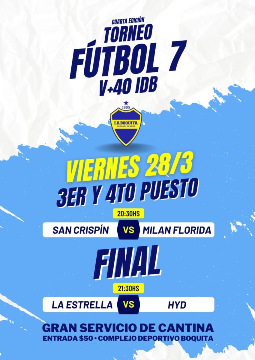 San Crispín y Milán Florida a las 20.30 hs jugarán mañana el partido por el tercer puesto, y La Estrella y HyD a las 21.30 hs el de la gran final del Torneo de Fútbol 7 V+40 que se disputa en Complejo Deportivo Boquita de Sarandí Grande. Como durante todo el campeonato, la entrada costará $ 50 y habrá servicio de cantina.