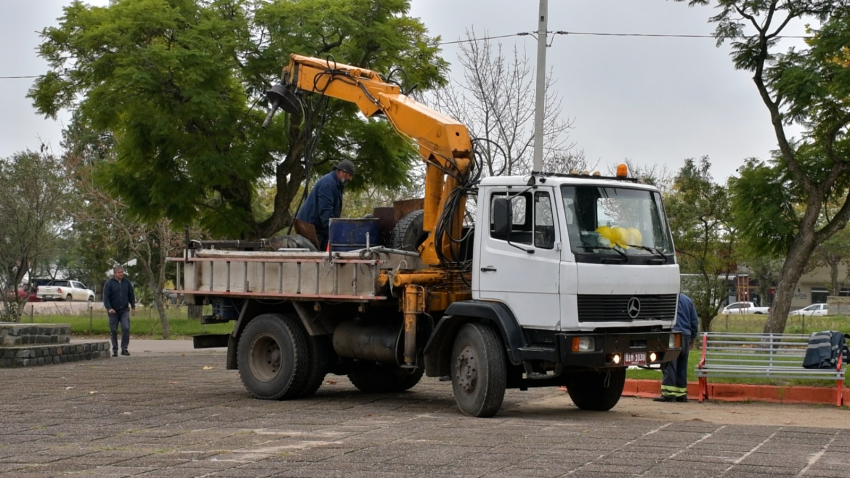 Poda de árboles y poceado con el propósito de instalar nuevos focos en la Plaza Gallinal comenzaron a practicarse en las últimas horas por parte del personal del Municipio de Sarandí Grande y la Intendencia Municipal de Florida, informó a Sarandí 365 el Alcalde de Sarandí Grande, Cayetano Stopingi.