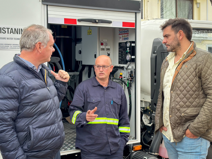 Se hizo entrega hace instantes de un nuevo camión lava contenedores para la ciudad de Sarandí Grande, con la presencia del Intendente de Florida, Guillermo López Méndez, el Director de Descentralización, Franciso Acerenza y el Alcalde de Sarandí Grande, Cayetano Stopingi.