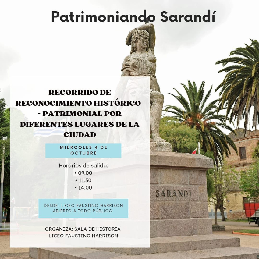 El miércoles 4 de octubre, la Sala de Historia del Liceo Faustino Harrison en Sarandí Grande organiza "Patrimoniando Sarandí", un recorrido de reconocimiento histórico-patrimonial por diferentes lugares de la ciudad.