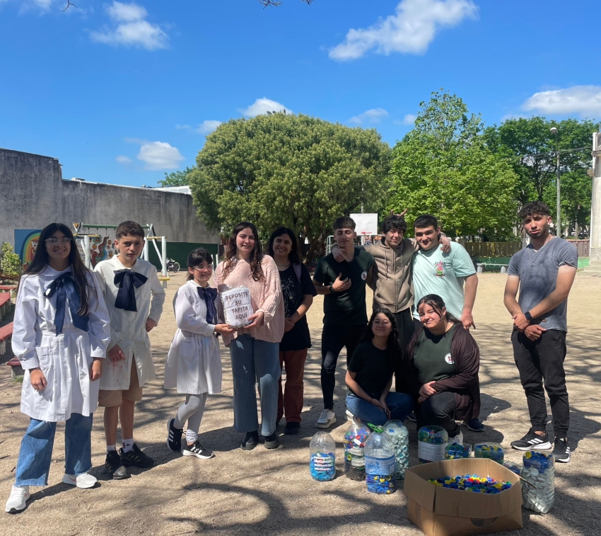 Estudiantes de 5to y 6to año Artístico del Liceo Faustino Harrison de Sarandí Grande, bajo la dirección de la profesora Viviana Fuentes, entregaron a alumnos de la Escuela N° 38 las tapitas de plástico que sobraron del mural para promover la empatía construído recientemente, con el objetivo de que los escolares puedan crear su propio mural.