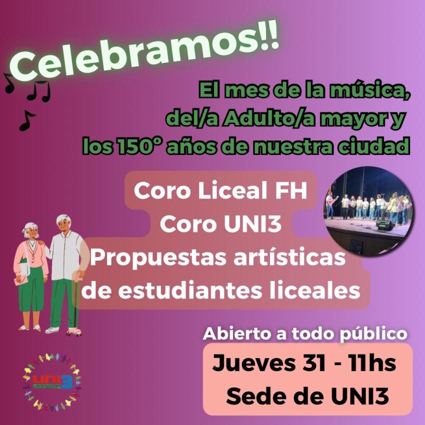 Mañana se llevará a cabo un encuentro musical intergeneracional que contará con la participación de los coros de UNI3 y del Liceo Faustino Harrison de Sarandí Grande, en una actividad abierta a todos, incluyendo docentes, alumnos y familiares.