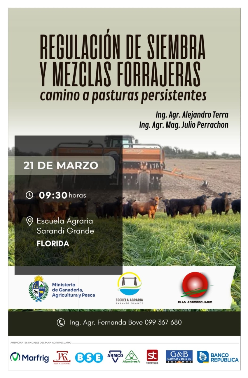 Una jornada abierta para productores sobre mezclas forrajeras y regulación de siembras tendrá lugar a las 9.30 hs del 21 de marzo en las instalaciones de la Escuela Agraria de Sarandí Grande, con el apoyo del Instituto Plan Agropecuario y el Ministerio de Ganadería, Agricultura y Pesca (MGAP).