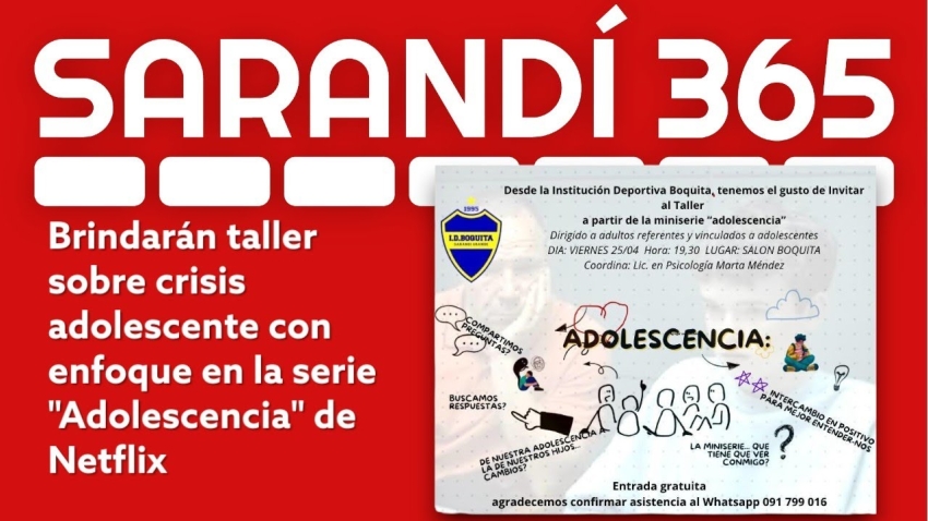 Un taller destinado a familiares, docentes o referentes comunitarios de adolescentes se llevará a cabo el viernes a las 19:30 horas en Institución Deportiva Boquita de Sarandí Grande, en un actividad que tuvo como disparador la serie "Adolescencia" de Netflix, informó a Sarandí 365 la Psicóloga Marta Méndez, quien estará a cargo del taller.