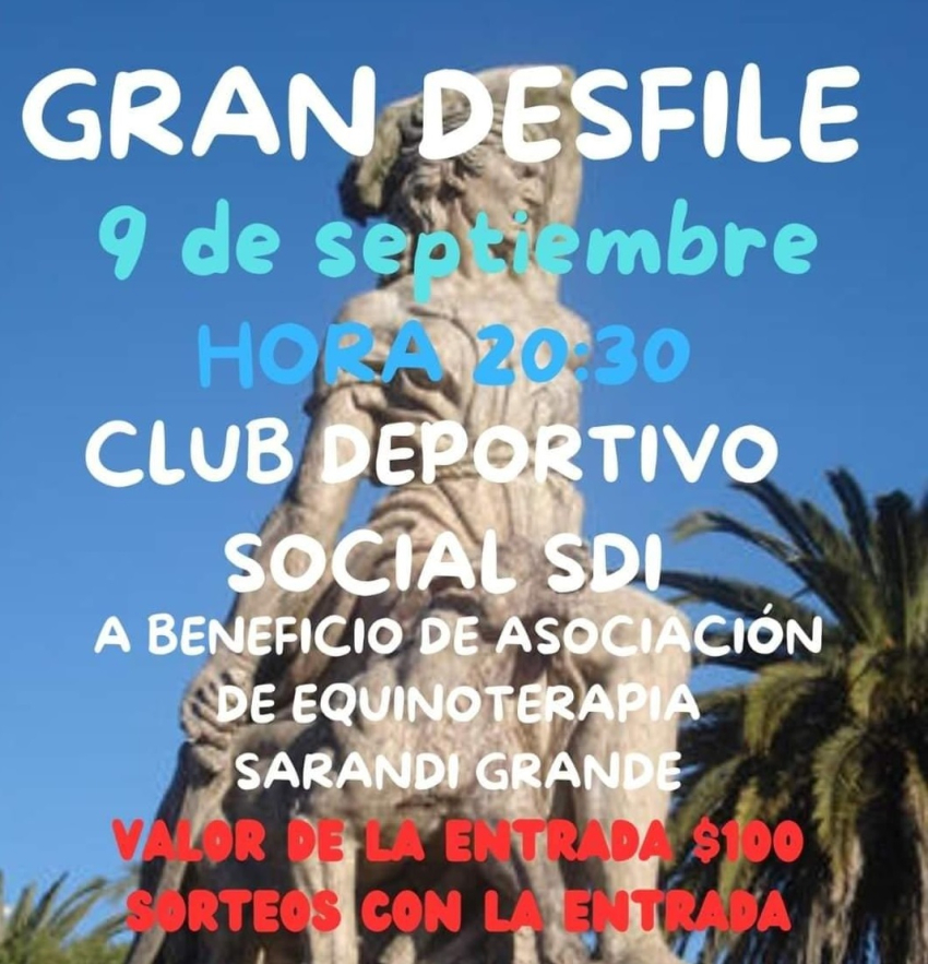 El 9 de septiembre, el Club Deportivo Social Sarandí de Sarandí Grande será el anfitrión de un Gran Desfile a beneficio de la Asociación de Equinoterapia. El evento comenzará a las 20:30 horas y promete ser una noche llena de moda y entretenimiento.