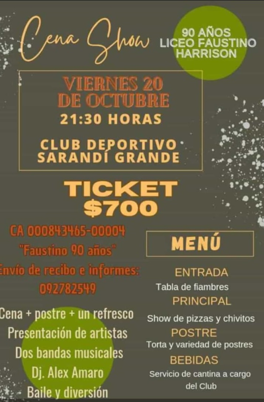 El Liceo Faustino Harrison celebrará su 90° aniversario con una cena show que tendrá lugar el viernes 20 de octubre a las 21:30 horas en el Club Deportivo Sarandí Grande.