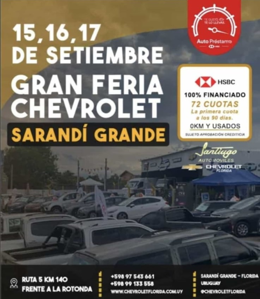 Este 15, 16 y 17 de septiembre, Chevrolet Florida te invita a su Gran Feria en Sarandí Grande. Ubicada frente a la rotonda en la Ruta 5 KM 140, esta feria es una oportunidad imperdible para aquellos que buscan un nuevo vehículo o un auto usado.