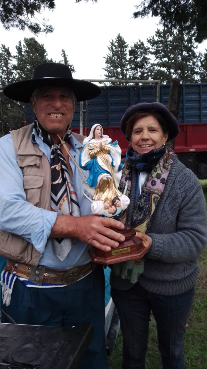 Dos marcheros de Sarandí Grande, Julio Fontes y Selva Martínez, que están participando en la 5ta. Marcha de la Virgen Abrecaminos con la Virgen de los 33, también están acompañando a la sociedad Los Patricios del 25 de Florida en su marcha hacia El Encuentro con el Patriarca, rumbo a la Meseta de Paysandú. En el día de hoy llegaron a Quebracho.
