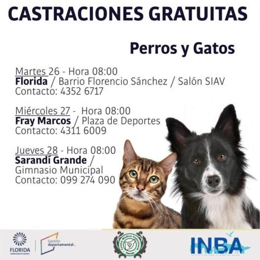 El jueves 28, en el Gimnasio Municipal de Sarandí Grande, se llevarán a cabo castraciones gratuitas de perros y gatos a partir de las 08:00 horas. Esta iniciativa es parte de los esfuerzos de la Dirección de Desarrollo Sostenible para promover la salud y el bienestar de las mascotas en las localidades de Florida.