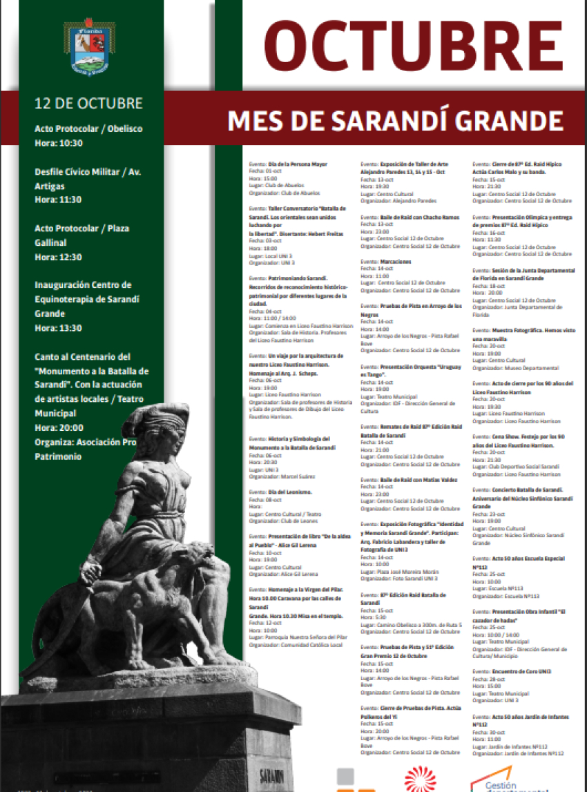 Se acaba de difundir el Programa de Festejos por el Mes de Sarandí Grande con motivo de conmemorarse un nuevo aniversario de la Batalla de Sarandí, que compartimos a continuación: