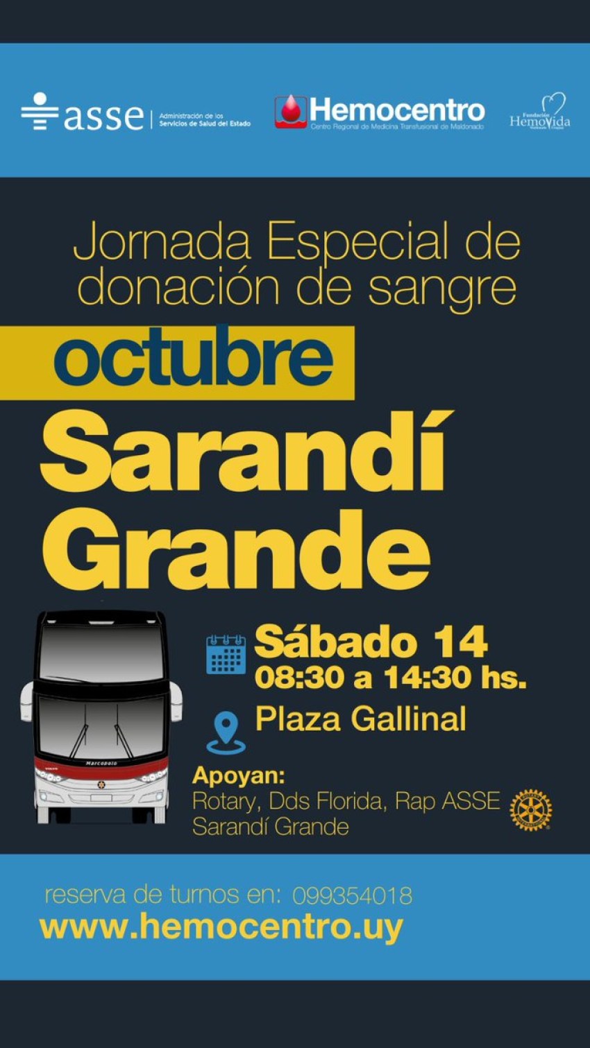 Una jornada especial de donación de sangre llevará a cabo en Sarandí Grande, el sábado 14 de octubre, desde las 08:30 hasta las 14:30 horas en la Plaza Gallinal la Administración de los Servicios de Salud del Estado (ASSE), a través del Hemocentro y Hemovida, en conjunto con el Centro Regional de Medicina Transfusional de Maldonado,