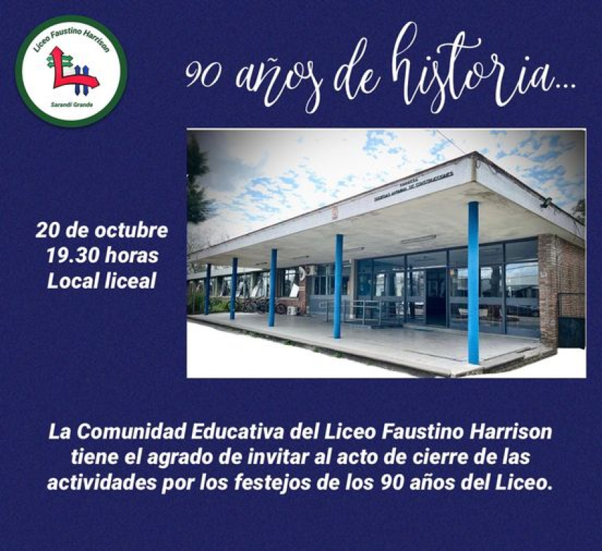 Con un acto y una cena show para la que se han vendido más de 200 tickets, y que contará con la presentación de Majo y La del 13, culminarán hoy los festejos correspondientes a la celebración de los 90 años del Liceo Faustino Harrison de Sarandí Grande. El acto tendrá lugar a las 19.30 hs en la propia institución educativa, en tanto la Cena Show se desarrollará a partir de las 21.30 hs en el Club Deportivo y Social Sarandí.