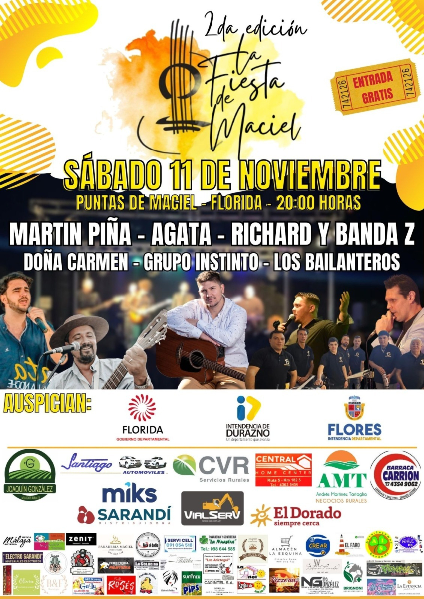 La 2da edición de la Fiesta Maciel se celebrará el sábado 11 de noviembre en Puntas de Maciel, Florida, y promete ser una noche llena de diversión y entretenimiento, con entrada gratuita y a beneficio de obras en ésa comunidad. La fiesta comenzará a las 20:00 horas y los asistentes podrán disfrutar de Martín Piña, Agata, Richard y Banda Z Doña Carmen, Grupo Instinto y Los Bailanteros.