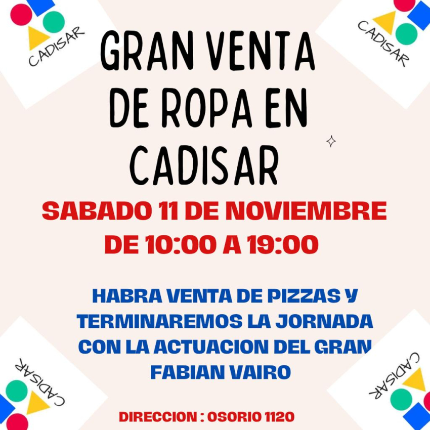El próximo sábado 11 de noviembre, CADISAR (Capacidades Diferentes Sarandí Grande) organizará una venta de ropa y comestibles en su sede en Osorio 1120, casi Faustino Harrison. La actividad se llevará a cabo entre las 10 y las 19 horas.