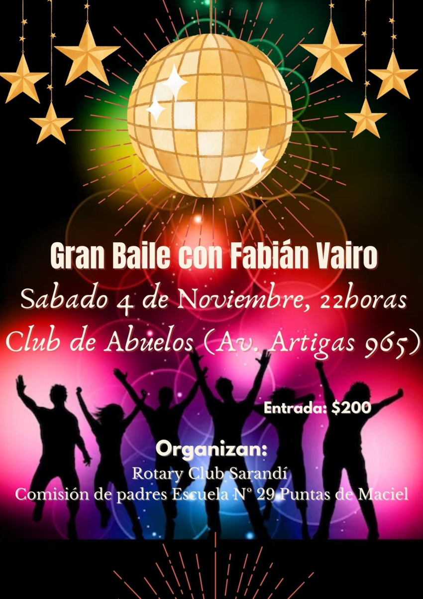 Un baile con el músico Fabián vairo se celebrará hoy a las 22 horas el Club de Abuelos de Sarandí Grande, organizado por el Rotary Club Sarandí y la Comisión de Padres de la Escuela N° 29 Puntas de Maciel, a un costo de $ 200.