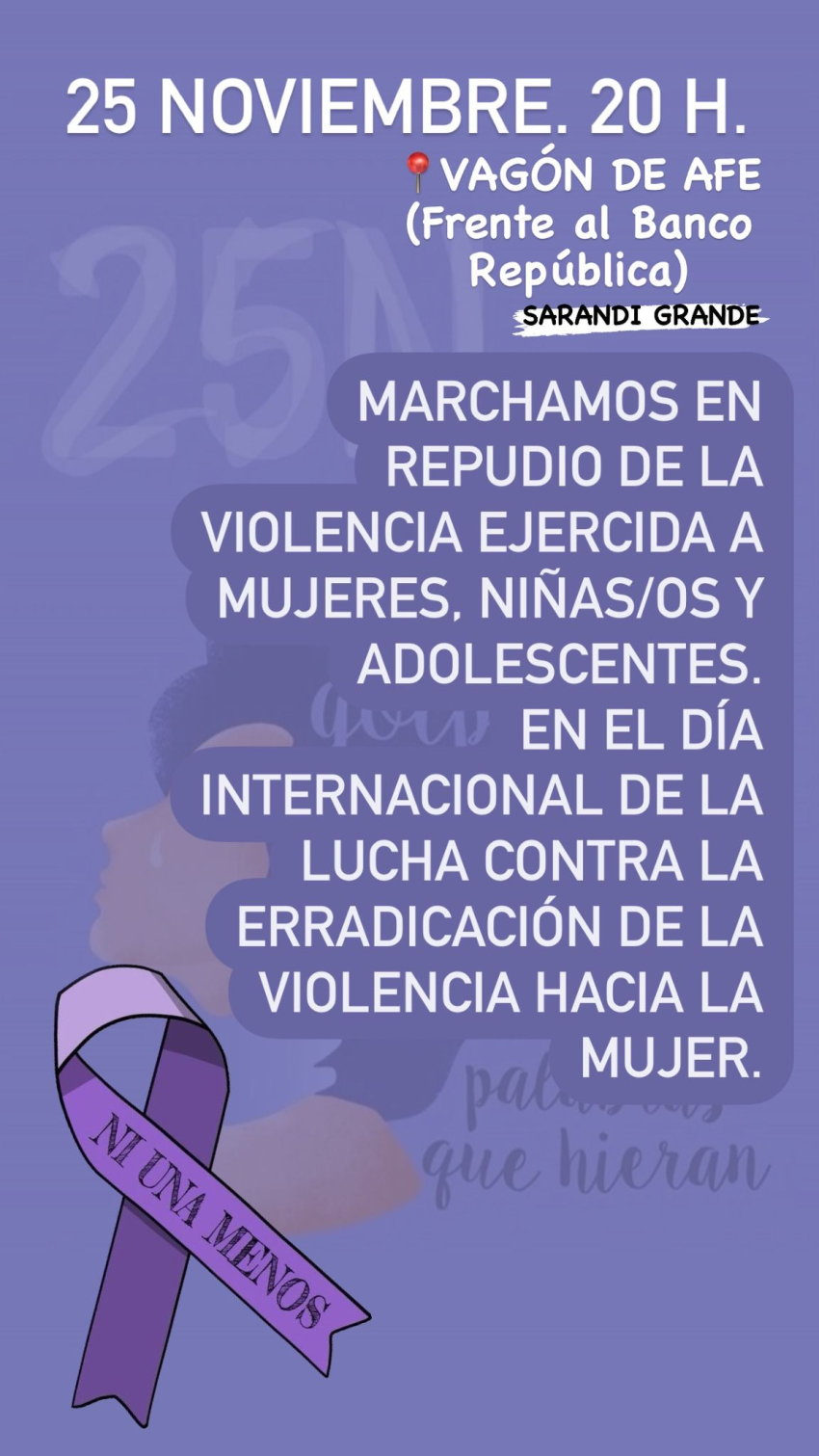 El 25 de noviembre, a las 20:00 horas, se llevará a cabo una marcha en Sarandí Grande en repudio a la violencia ejercida a mujeres, niñas y adolescentes, organizada por Colectivo Sarandí Grande, un grupo que se ha movilizado a favor de los derechos y la justicia social.
