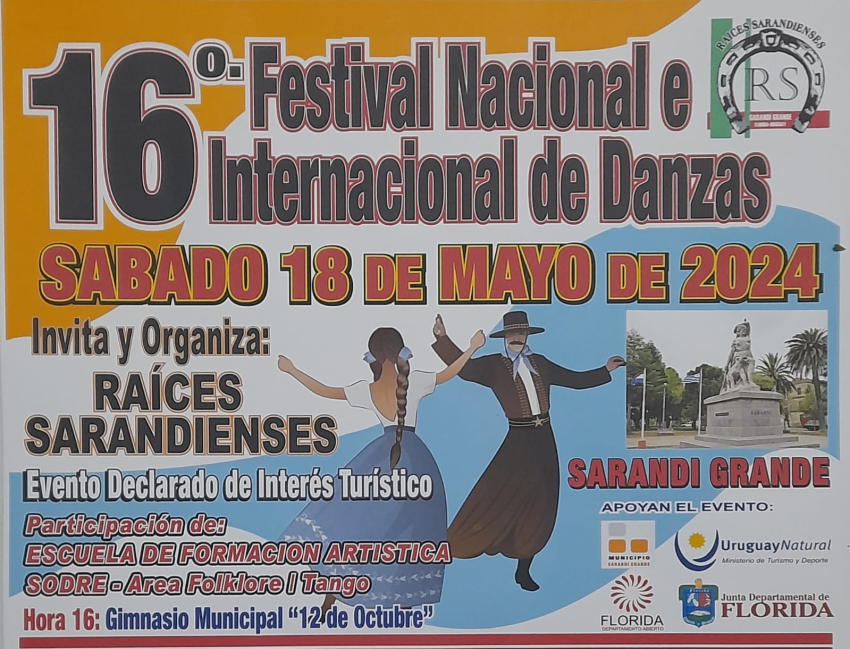Aproximadamente 15 grupos de danza provenientes de diversas regiones como Río Branco, Treinta y Tres, San José, Montevideo, Las Piedras, Canelones, Tacuarembó, Carmen, Durazno, Florida y Entre Ríos (Argentina) ya confirmaron su participación en el 16º Festival Nacional e Internacional de Danzas el 18 de mayo desde las 16:00 hs en el Gimnasio Municipal 12 de Octubre de Sarandí Grande, organizado por Raíces Sarandienses, anunció a Sarandí 365 la presidenta de la institución, Maestra Ivana Porcal, quien señaló que inscripciones continuarán abiertas hasta el 12 de mayo.