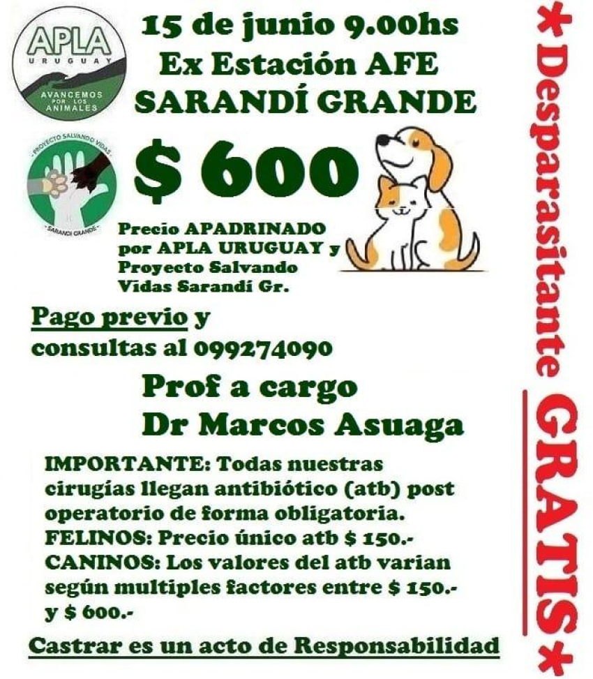El Proyecto "Salvando Vidas" en Sarandí Grande está organizado una jornada de castración económica el próximo 15 de junio a las 9:00 hs en la Ex Estación AFE de Sarandí Grande para promover la tenencia responsable de mascotas y controlar la población animal.