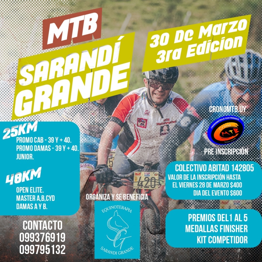 Comenzó la inscripción para la 3ª edición de la Competencia de Mountain Bike que se llevará a cabo el 27 de abril en Sarandí Grande, partiendo desde el predio del Centro de Equinoterapia, ubicado en la rotonda de Sarandí Grande, km 140 de la ruta 5, con el objetivo de recaudar fondos para la institución.