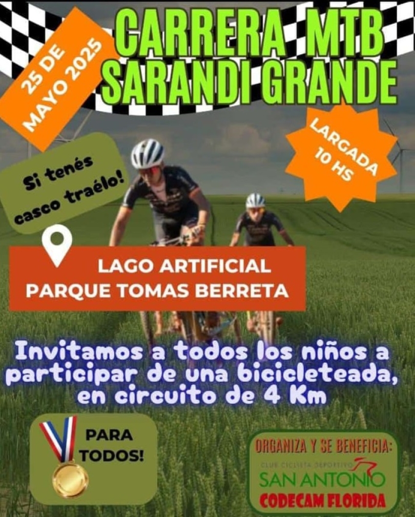 Una bicicleteada para niños en un circuito de 4 km incluirá la carrera de MTB que se desarrollará el próximo domingo 25 de mayo a partir de las 10:00 horas en el Lago Artificial del Parque Tomás Berreta de Sarandí Grande.