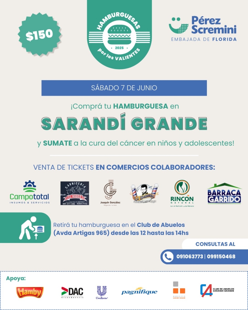 El próximo sábado 7 de junio, Sarandí Grande será escenario de la tradicional campaña solidaria “Hamburguesas por los Valientes 2025”, organizada por la Embajada de Florida de la Fundación Pérez Scremini, con el objetivo de recaudar fondos destinados a la cura del cáncer en niños y adolescentes.