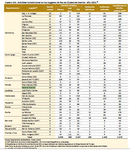 73 casos de violencia basada en género fueron atendidos en un año en el Juzgado de la 10ma Sección Judicial de Florida con sede en Sarandí Grande en el lapso de un año, según las últimas cifras públicas del Departamento de Estadísticas del Poder Judicial. Otros 30 asuntos fueron iniciados en ésa sede durante el mismo lapso por artículos del Código General del Proceso. Se celebraron 32 audiencias y se dictaron un total de 5 sentencias de carácter definitivo. Fueron solicitadas seis audiencias de conciliación, pero ninguna de ellas se concretó.