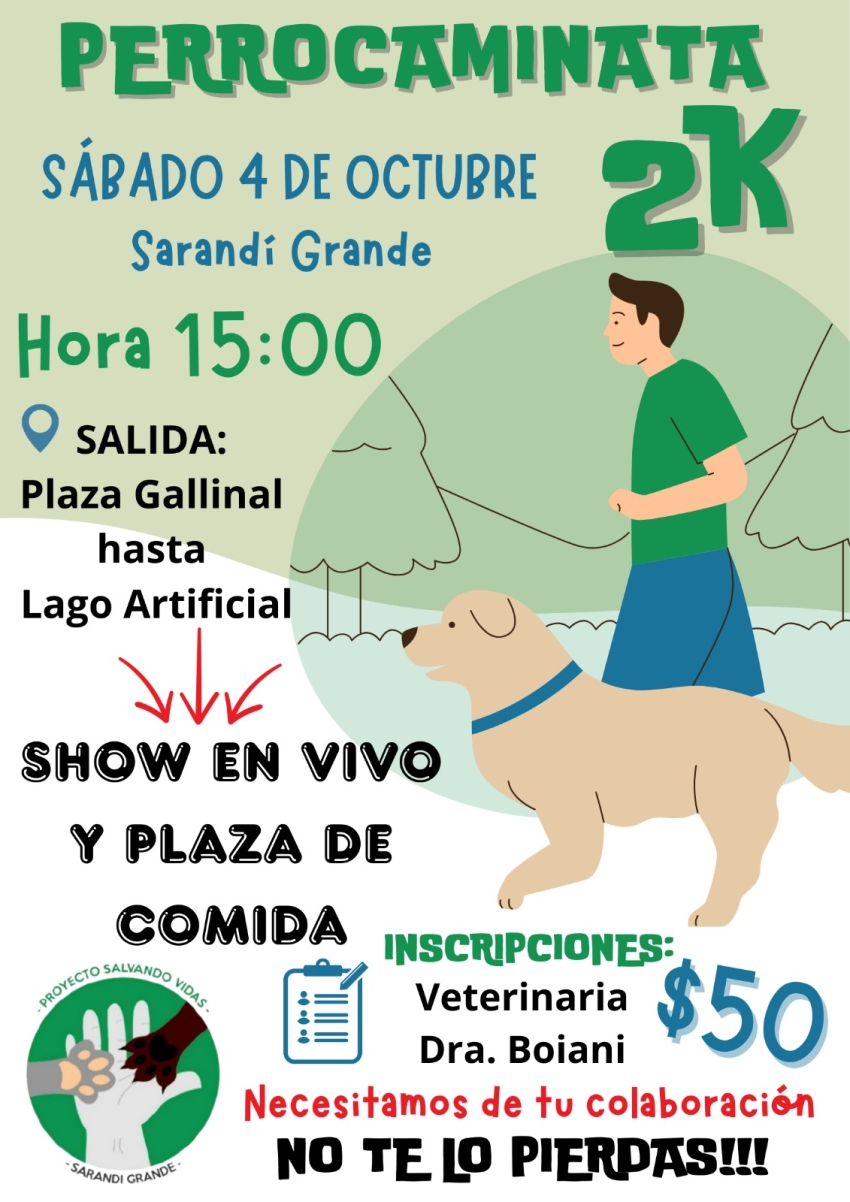 Este sábado 4 de octubre, a partir de las 15:00 horas, se realizará la "Perrocaminata 2K" en Sarandí Grande, una actividad solidaria que busca recaudar fondos para el Proyecto "Salvando Vidas", una ONG local que trabaja hace 9 años con animales abandonados.