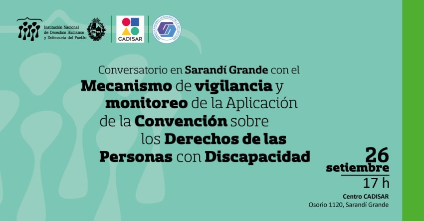 La Institución Nacional de Derechos Humanos y Defensoría del Pueblo realizará un conversatorio sobre el Mecanismo de vigilancia y monitoreo de la Aplicación de la Convención sobre los Derechos de las Personas con Discapacidad el 26 de septiembre a las 17 horas en el Centro CADISAR de Sarandí Grande, para abordar el cumplimiento de esta normativa internacional.