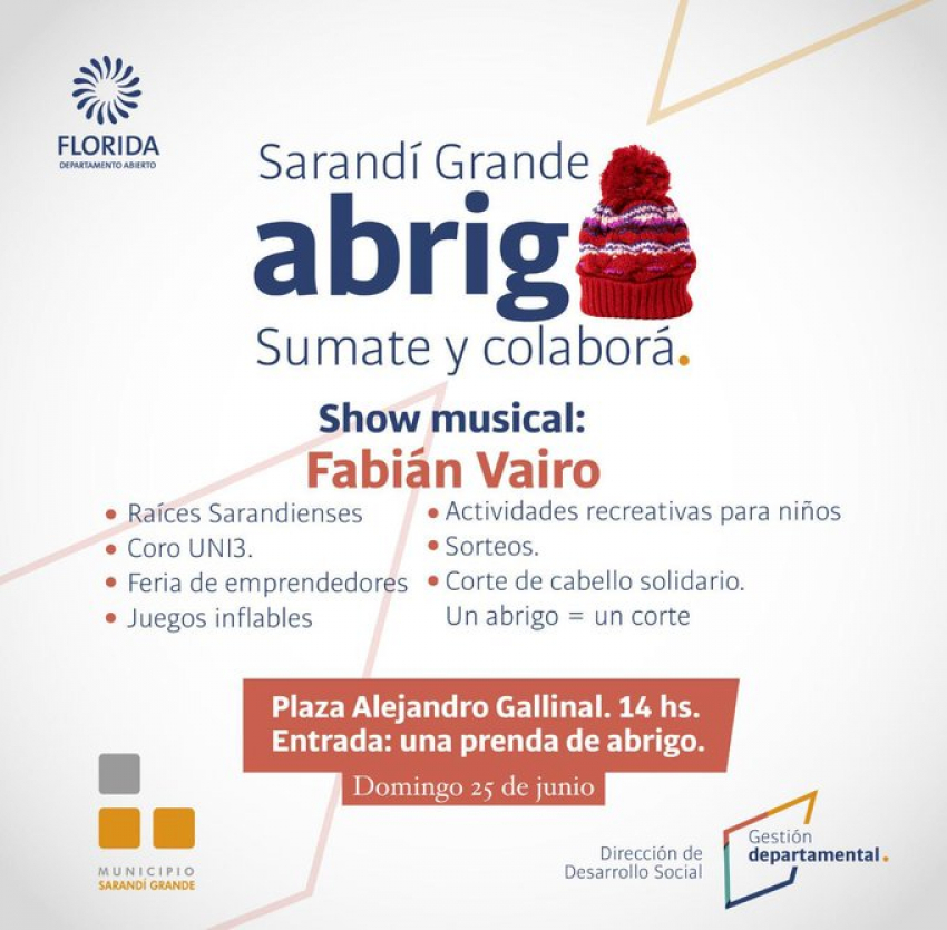 Fueron anunciados en las últimas horas los detalles de la Feria de Emprendedores y Campaña del Abrigo a cumplirse el domingo desde las 14 hs en plaza Alejandro Gallinal de Sarandí Grande; evento organizado por el Municipio de Sarandí Grande y la Dirección de Desarrollo Social de la Intendencia Municipal de Florida.