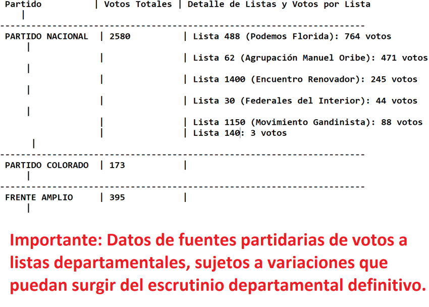 2580 votos obtuvo al Órgano Deliberativo Departamental el Partido Nacional, 395 el Frente Amplio y 173 el Partido Colorado en Sarandí Grande, según información de fuentes partidarias, preliminar y sujeta a variaciones del escrutinio oficial departamental.