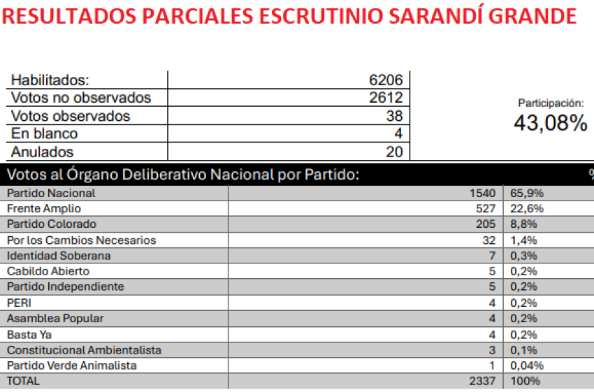 Con una participación del 43.08% de los votantes habilitados en las Elecciones Internas en Sarandí Grande, el Partido Nacional obtuvo un 65.9% de los votos, el Frente Amplio el 22.6% y el Partido Colorado un 8.8%.