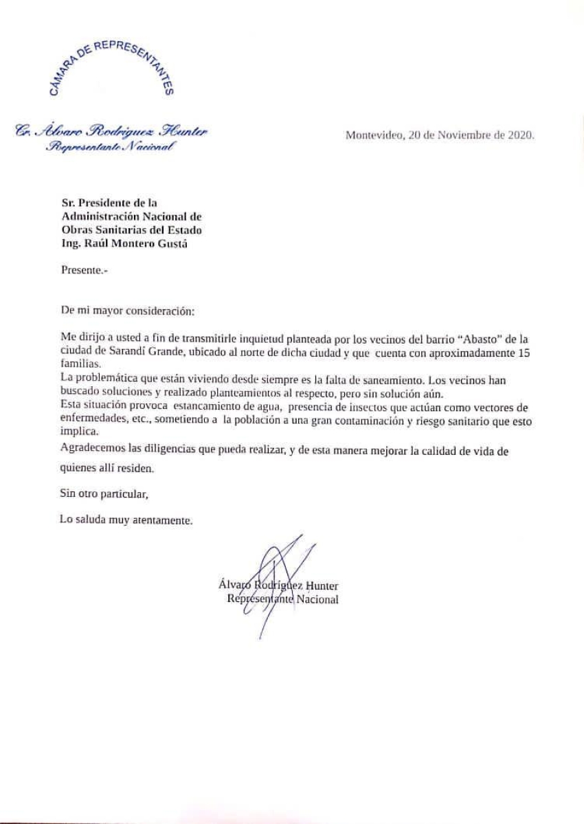 Tras tomar conocimiento de la situación, en 2020 el legislador transmitió a OSE la preocupación de los habitantes del barrio, detallando los problemas derivados de la falta de saneamiento, como el estancamiento de agua y la proliferación de insectos, que representaban un riesgo sanitario significativo para la comunidad.