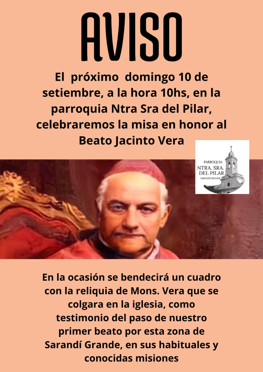 Una misa en honor al Beato Jacinto Vera celebrará el próximo domingo 10 de setiembre a las 10:00 a.m. la Parroquia Nuestra Señora del Pilar en Sarandí Grande. Durante la ceremonia, se bendecirá y colocará en la iglesia un cuadro con la reliquia de Mons. Vera como un testimonio de su presencia en esta zona durante sus misiones habituales y conocidas.