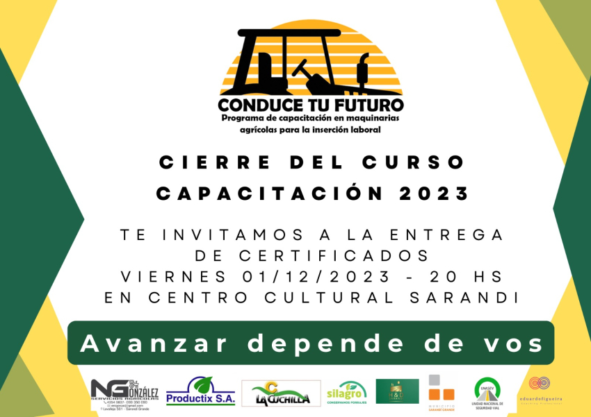 Mañana, a las 20 horas, en el Centro Cultural de Sarandí Grande tendrá lugar el cierre oficial con la entrega de certificados del exitoso programa "Conduce tu Futuro", impulsado por el Municipio y actores locales.