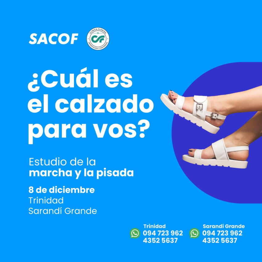 El viernes 8 de diciembre, el Servicio de Acompañantes SACOF, en colaboración con Clínica Florida Deportología y Fisioterapia, brindará nuevos estudios biomecánico de la marcha y la pisada en Trinidad y Sarandí Grande. Los interesados en participar, pueden agendarse en SACOF comunicándose al teléfono 4354 8826 en Sarandí Grande, o vía WhatsApp al 094723962.