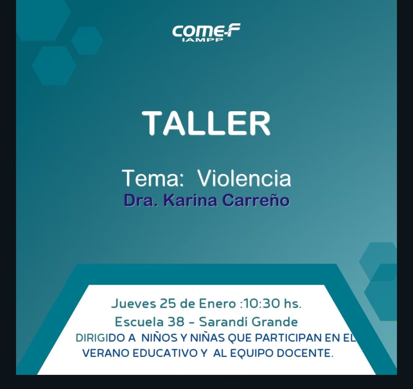 COMEF-IAMPP Sarandí Grande, llevará a cabo un taller sobre el tema de la violencia, a cargo de la Directora Técnica de la institución, Dra. Karina Carreño, con amplia formación en el área. El evento está programado para el jueves 25 de enero a las 10:30 hs. y se llevará a cabo en la Escuela N° 38 "Juan Antonio Lavalleja" de Sarandí Grande.