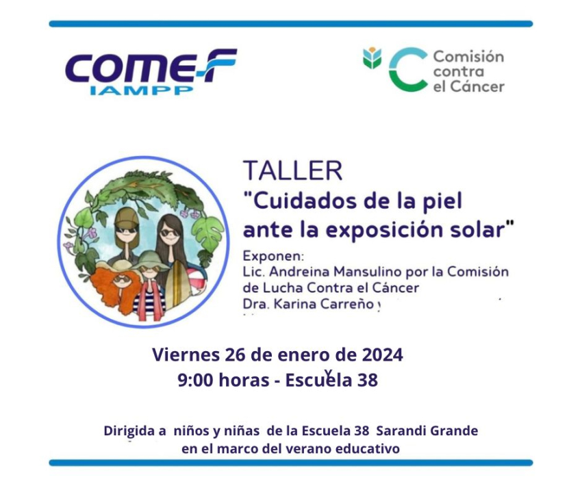 Un taller sobre "Cuidados de la piel ante la exposición solar" brindarán en la Escuela N° 38 de Sarandí Grande, en el marco del Programa Escuelas de Verano, COMEF-IAMPP Sarandí Grande y la Comisión Departamental de Lucha contra el Cáncer. La actividad contará con la participación de la Lic. Andreina Mansulino, representando a la Comisión de Lucha Contra el Cáncer, y la Dra. Karina Carreño, Directora Técnica de COMEF-IAMPP Sarandí Grande.